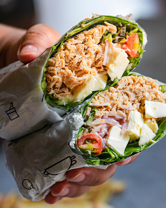 Um wrap de atum irresistível, com atum fresco, mix de folhas crocantes...