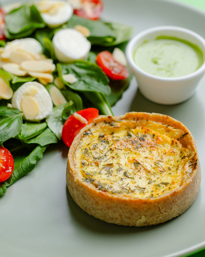 Mix de folhas, atum, cebola roxa, queijo minas, tomate cereja e molho frutaria.