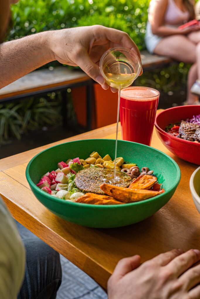 Falafel, cebola ROXA, molho vegano, tomate CEREJA, mix de folhas, milho e banana chips.