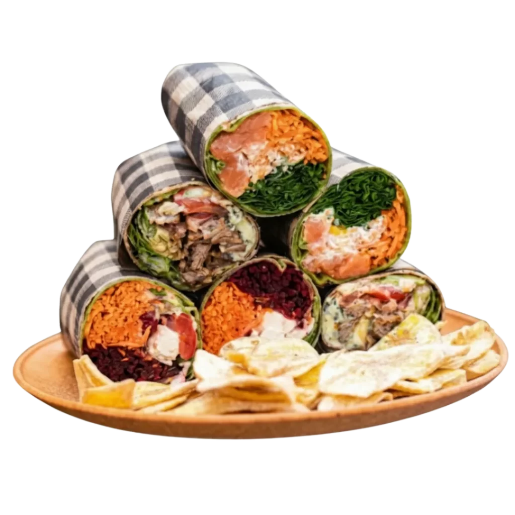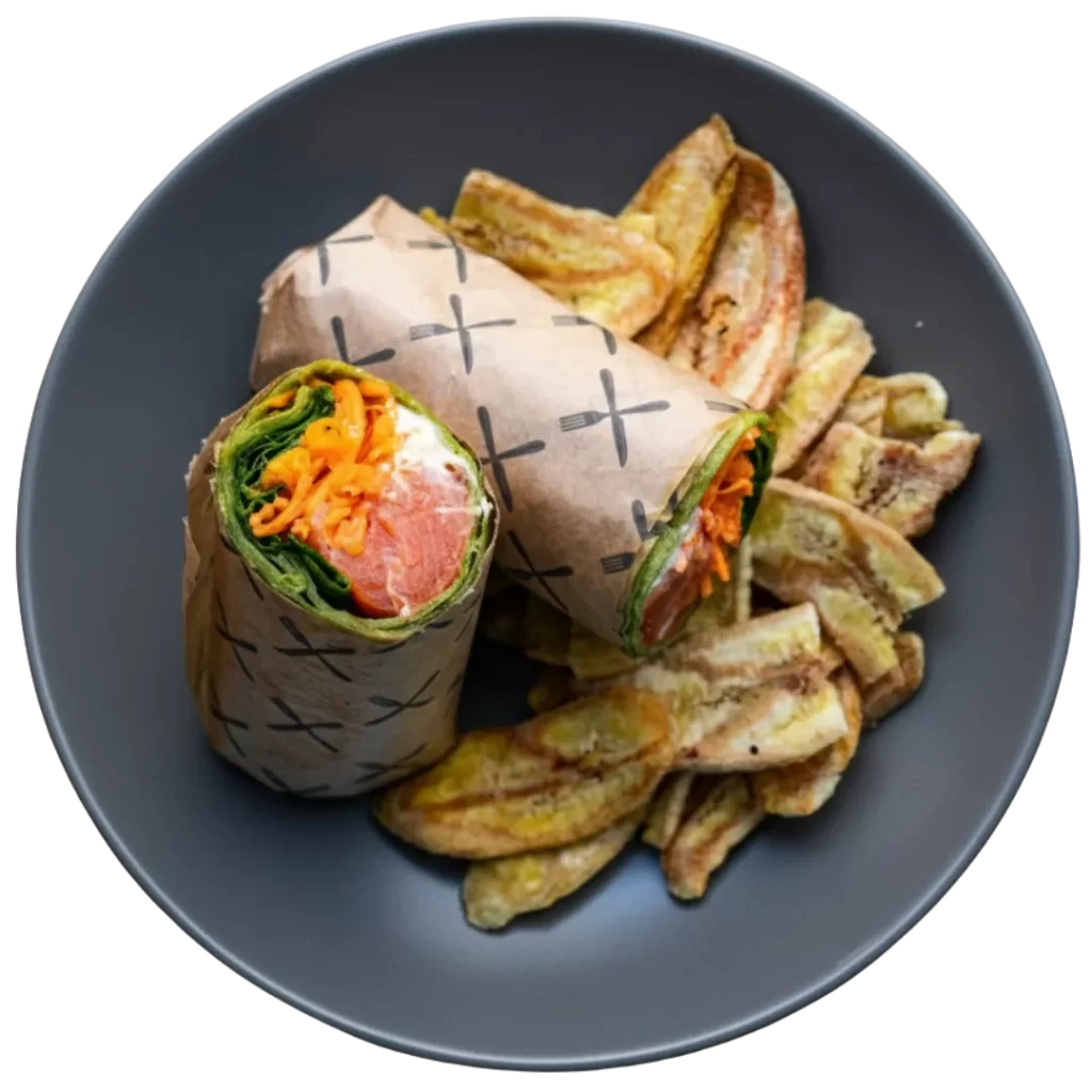 Frango, guacamole, búfula, tomate cereja, mix de folhas, parmesão, chips de banana.