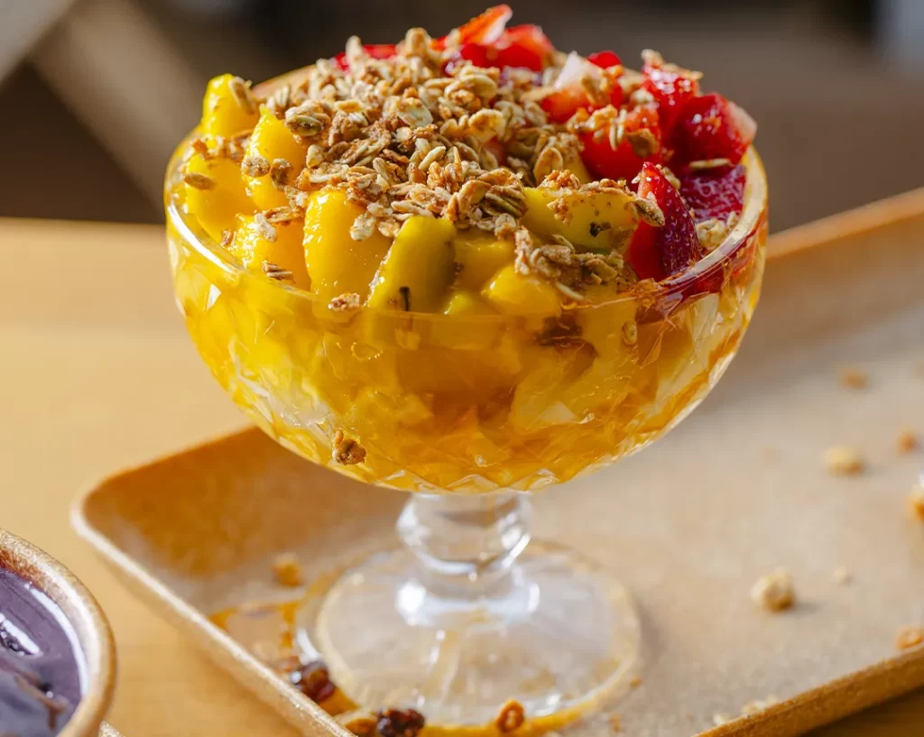 Acompanha granola e leite condensado light, mel ou suco de laranja.